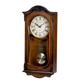 The gorgeous solid wood and wood veneer case is finished in walnut. Decorative carved accents adorn this impressive old world-looking wall clock. On the hour, a Westminster melody plays for your delight. Decorative screened glass protects the pendulum. Metal dial. Takes four AA batteries (not included). 19" high. 9" wide. 3 3/4" deep.
