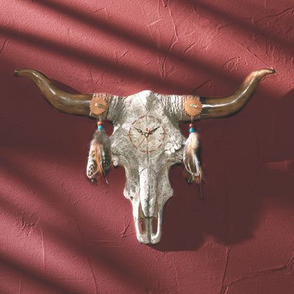 Southwestern bull skull wall clock decorated with beads and feathers. Uses 1 AA battery, not included. Alabastrite. 19 3/8'' x 1 3/4'' x 13 3/4'' high.
